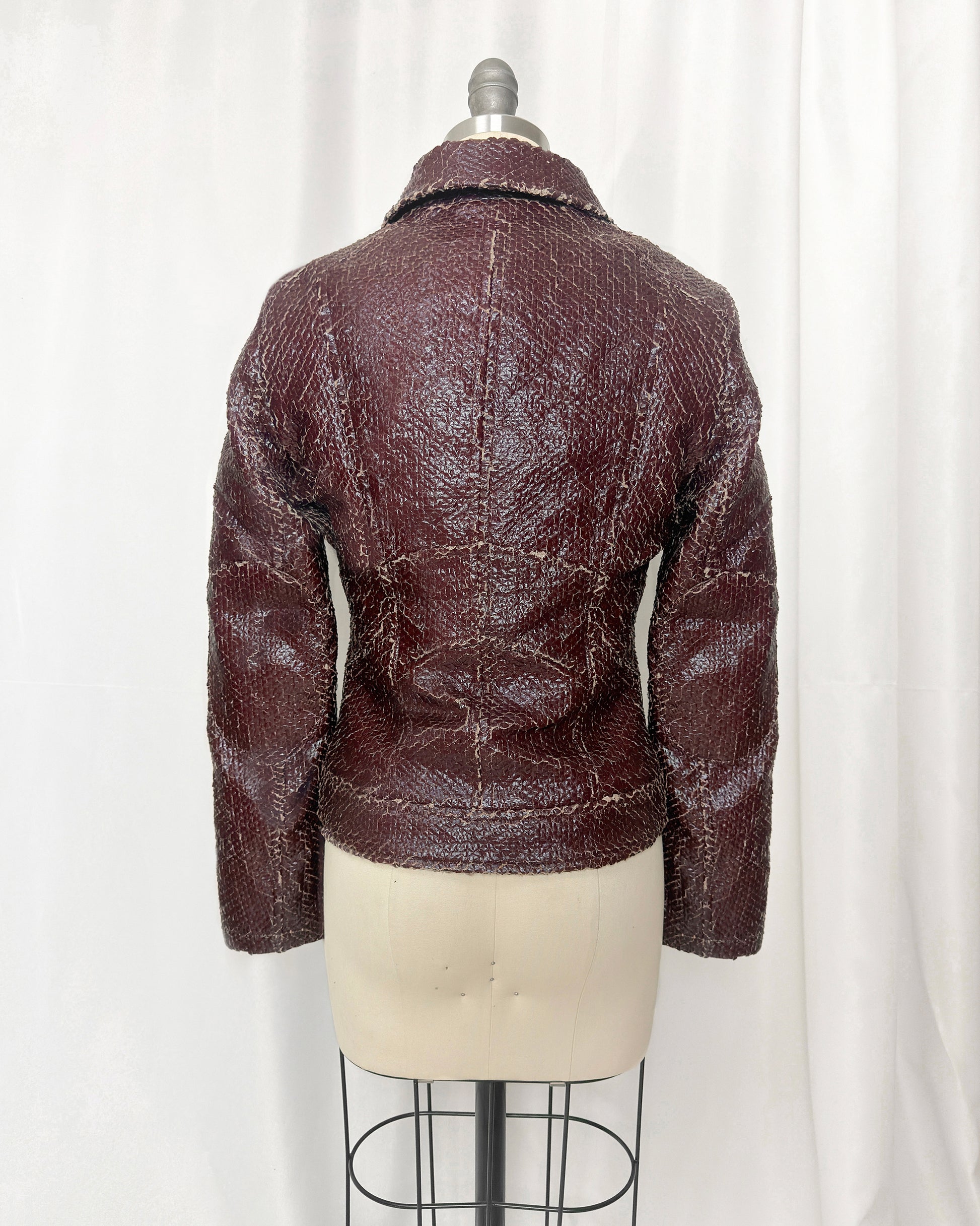 Features: burgundy; distressed finish; off center closure; gold tone hardware; fitted waist; padded interior for extra warmth; made in Italy.