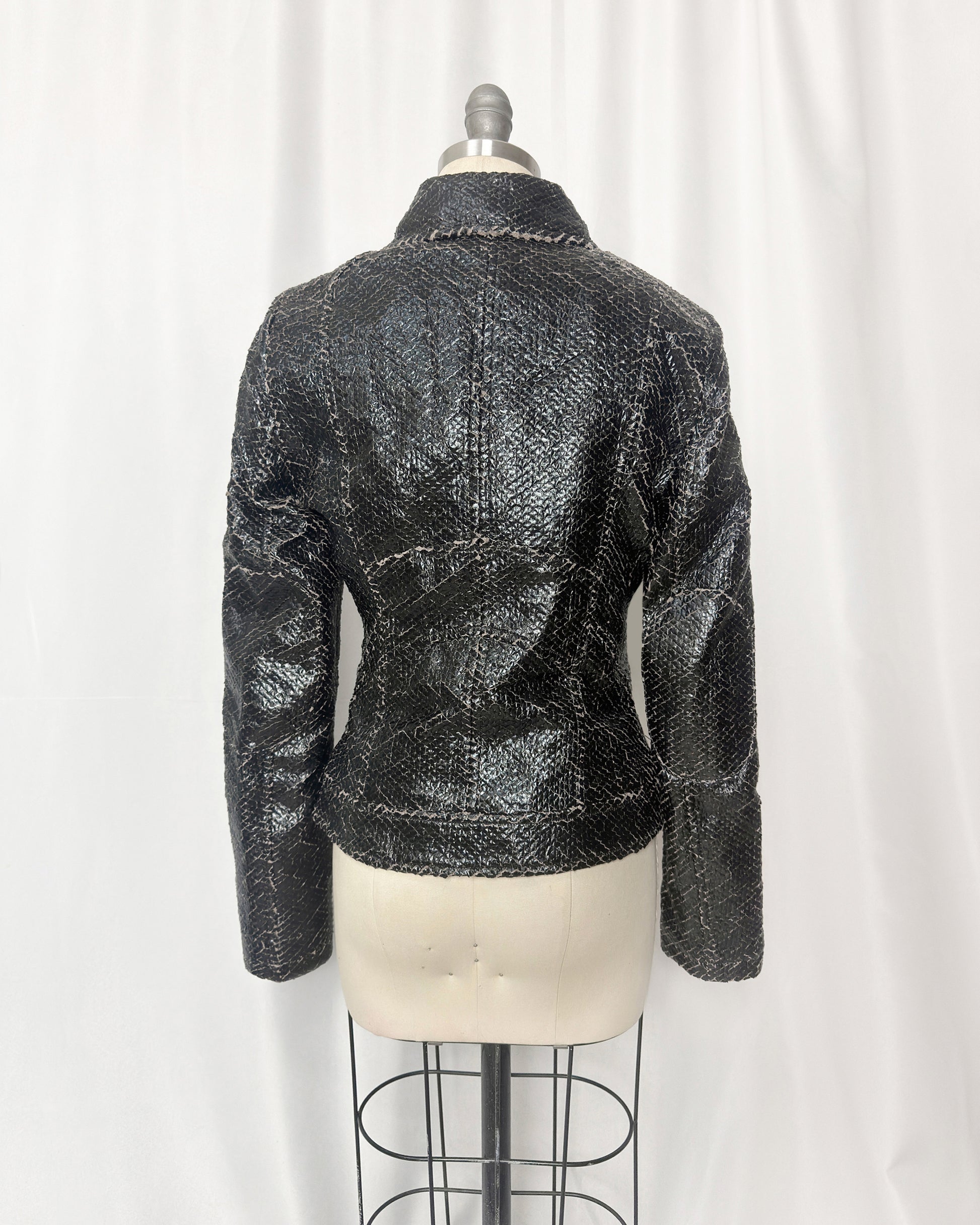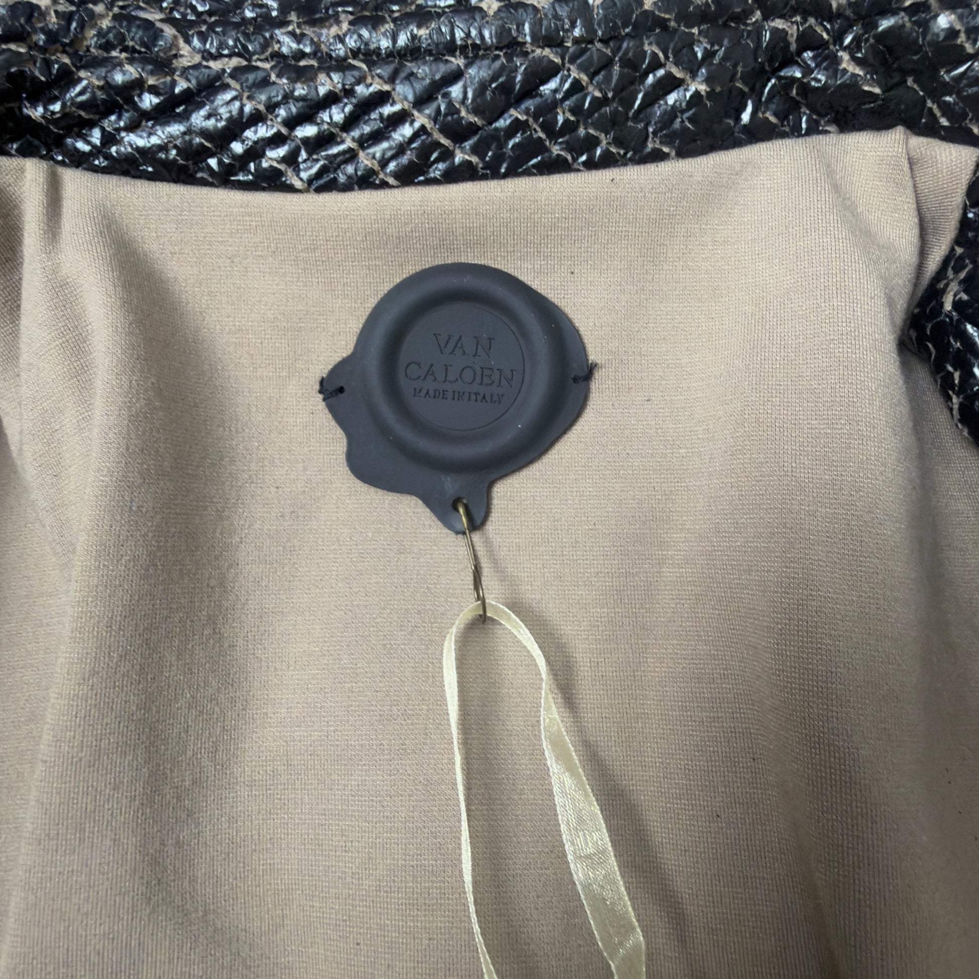Features: black; distressed finish; off center closure; gold tone hardware; fitted waist; padded interior for extra warmth; made in Italy.