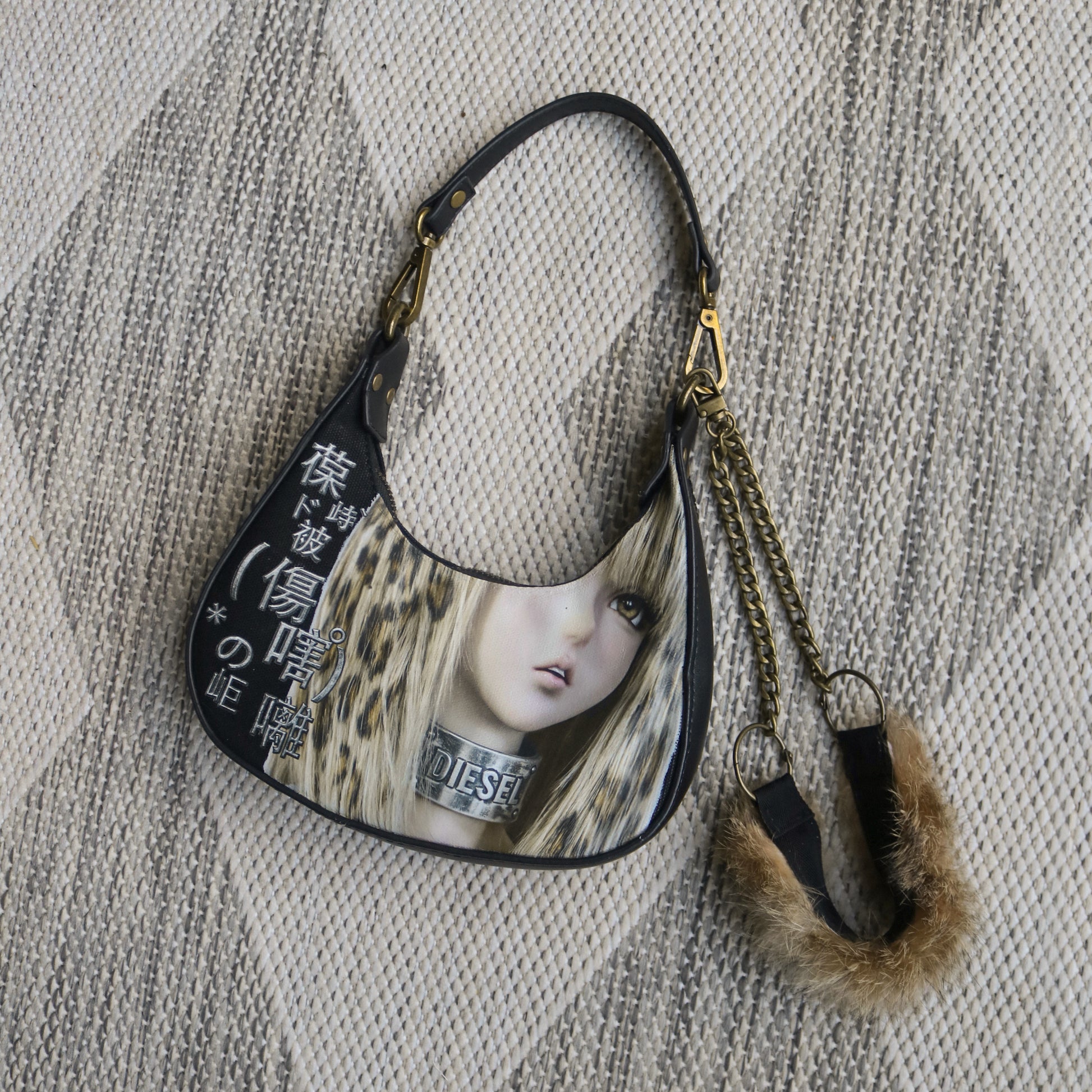 Features: black; cotton canvas; leather panels; graphic printed; fur accent; Diesel oval logo; crescent silhouette; detachable chain & leather strap; zip top closure.