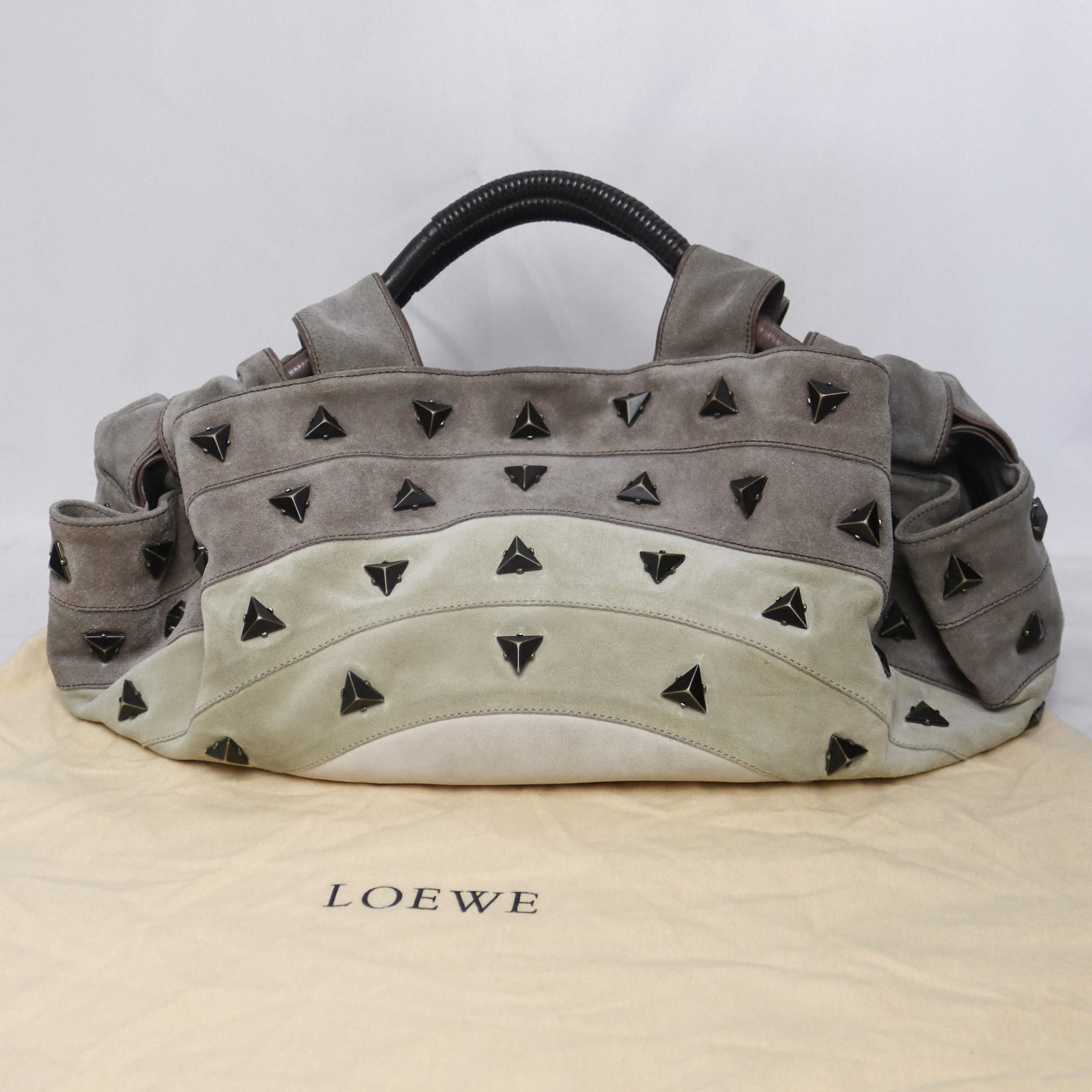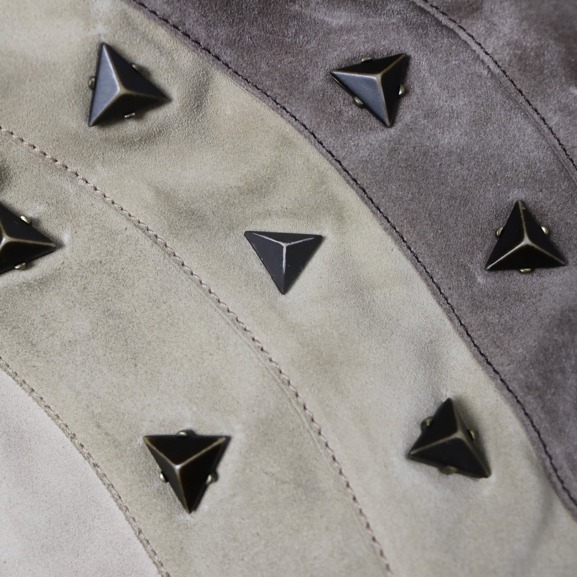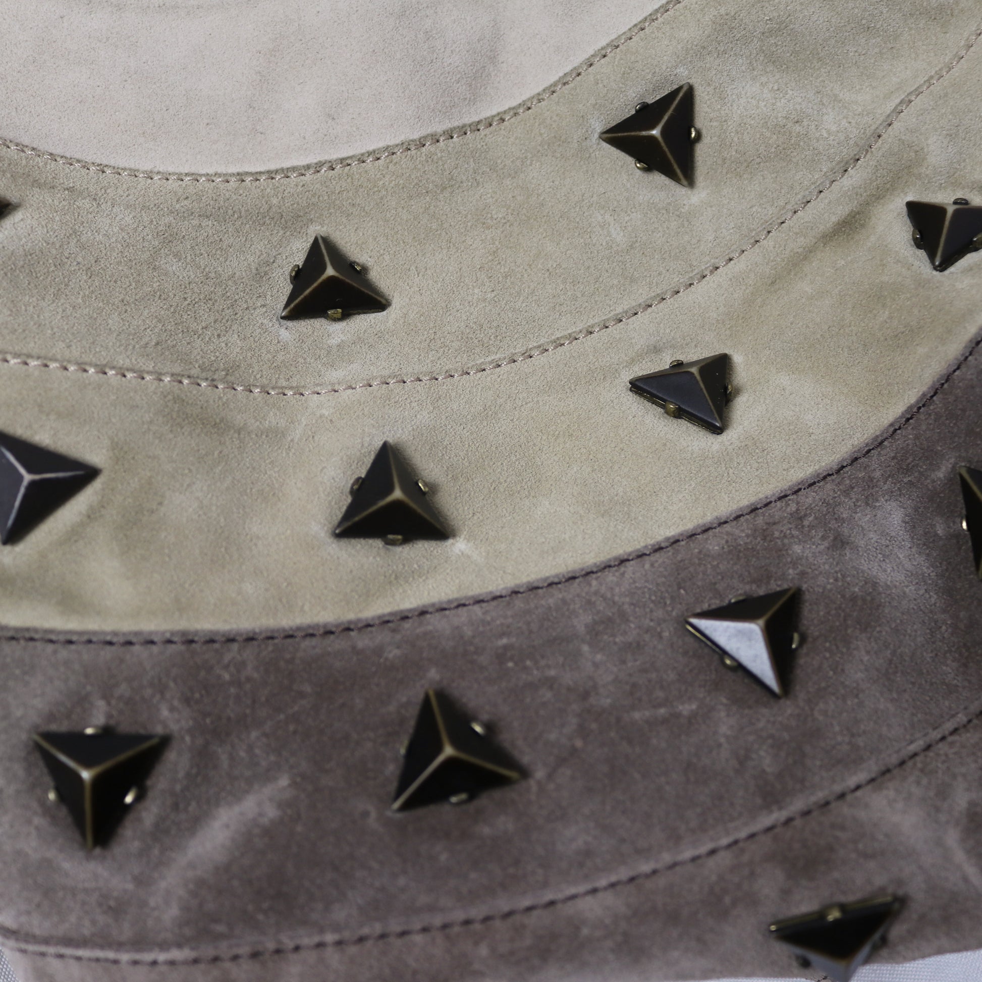 Features: grey/beige/cream; nubuck suede leather; pyramid stud embellishments; nappa leather interior; rolled handles; made in Italy.