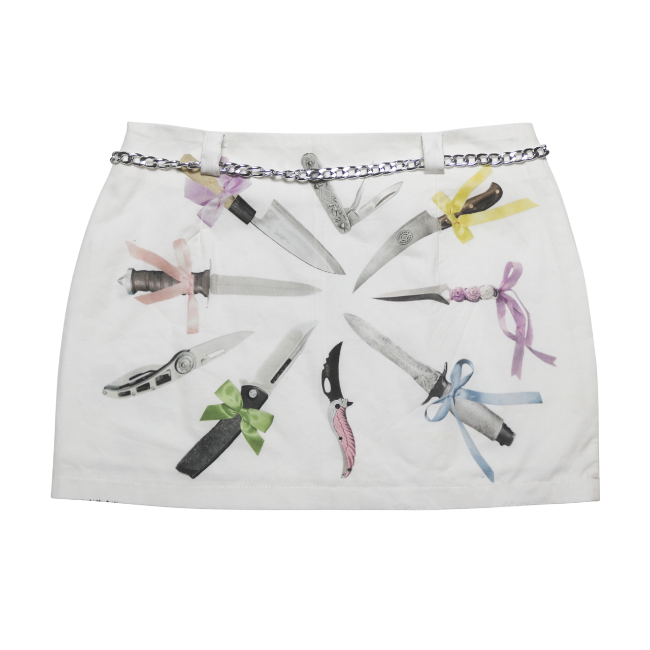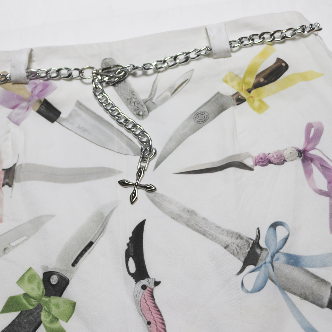 Features: white; low rise fit; graphic print to the front and back; chain belt; built-in shorts; concealed side zip.