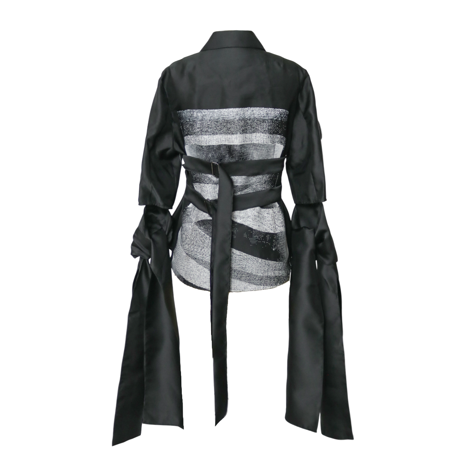 Features: black; convertible design; graphic print to the front; 3/4 sleeve; tie cuffs; detachable straps.