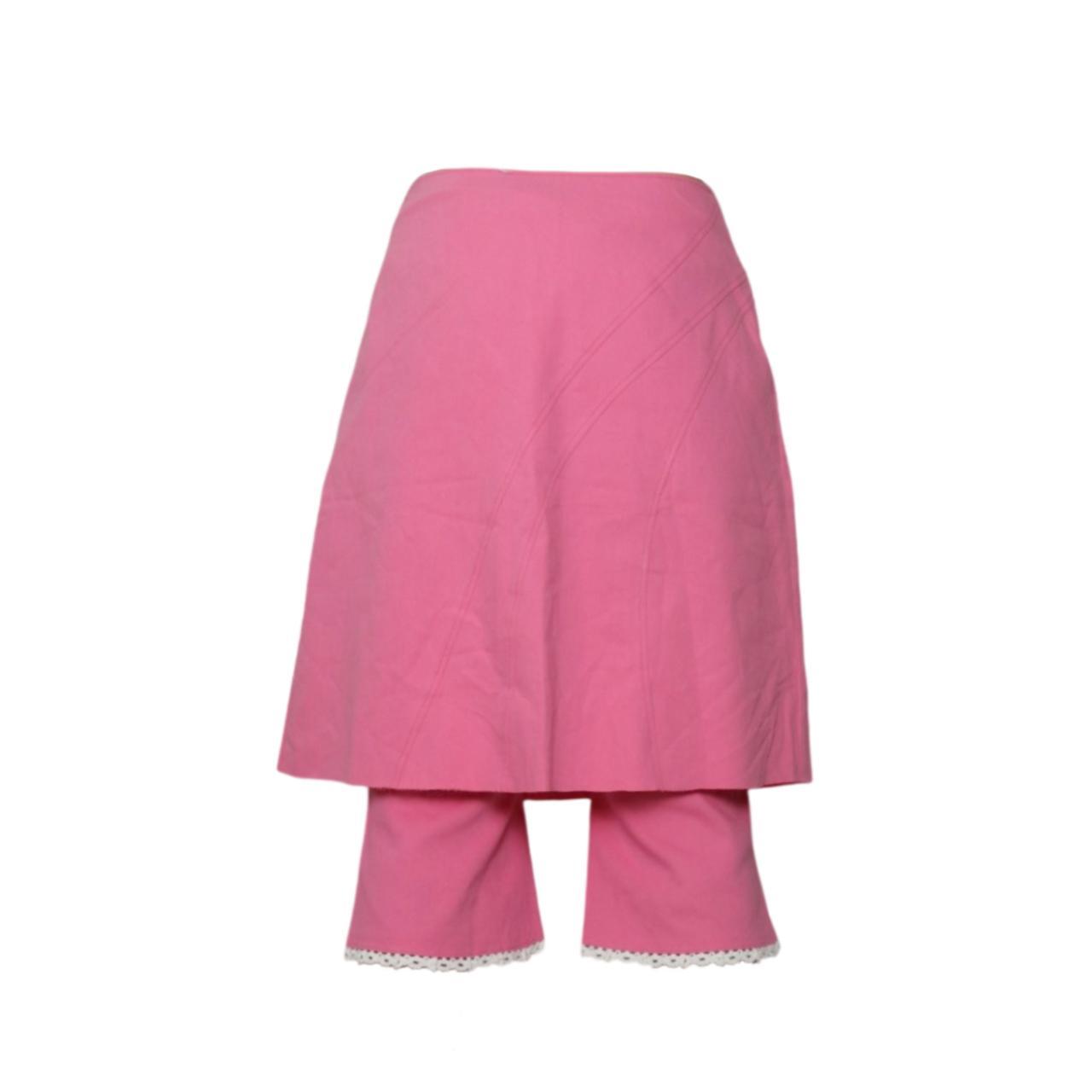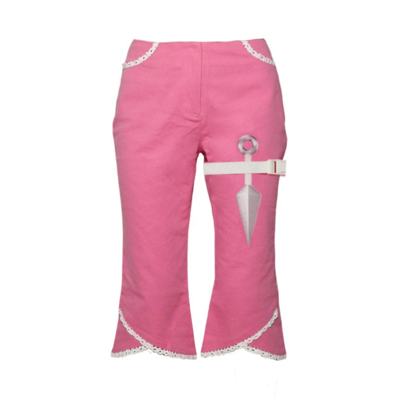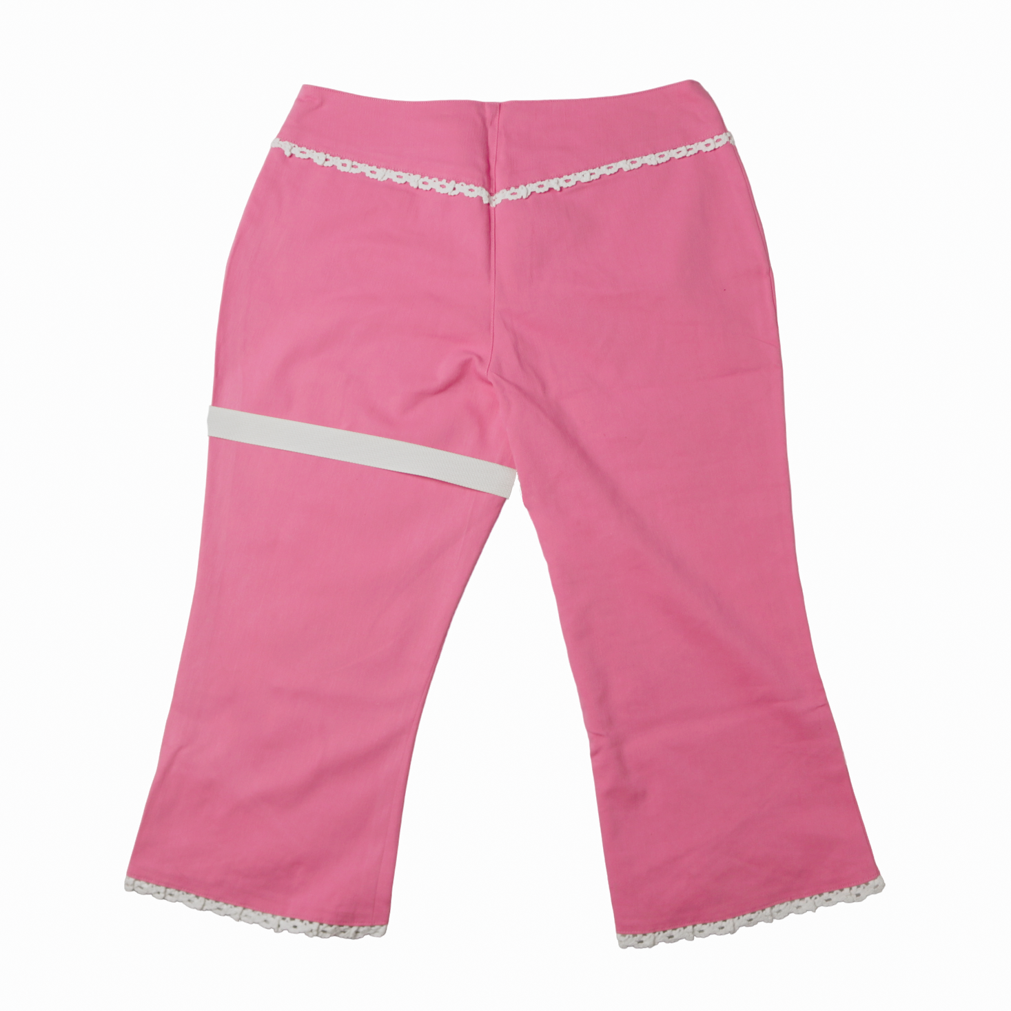 Features: pink; graphic print; strap detailing; lace trim; flared capri legs; low rise fit.