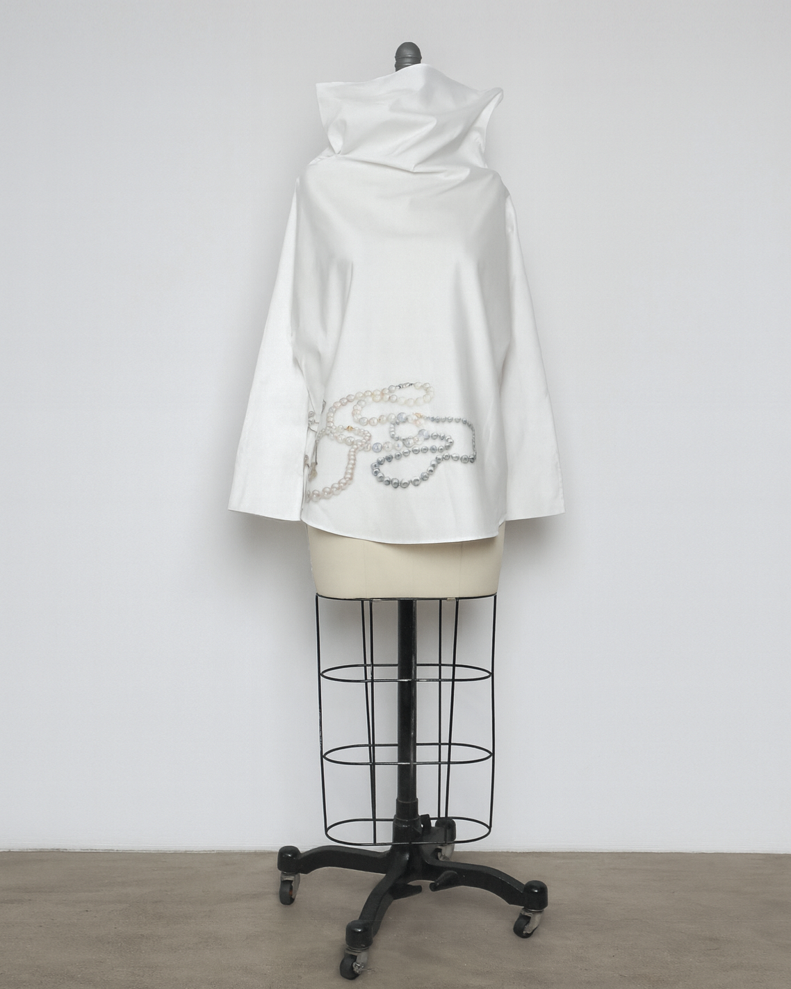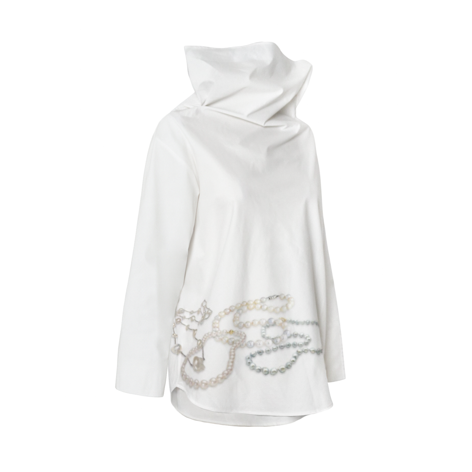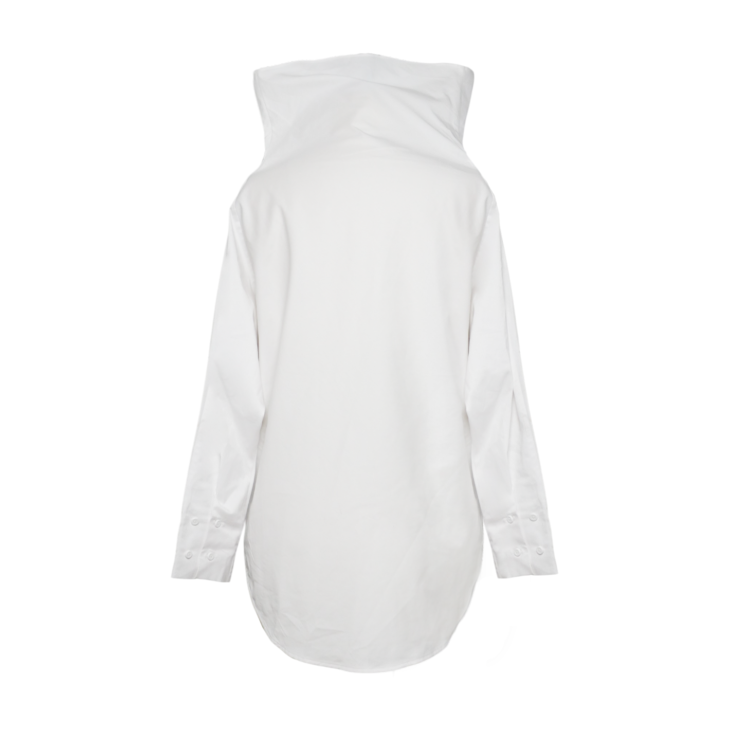 Features: white; graphic print; draped funnel collar; batwing sleeves; curved high-low hem; buttoned cuffs