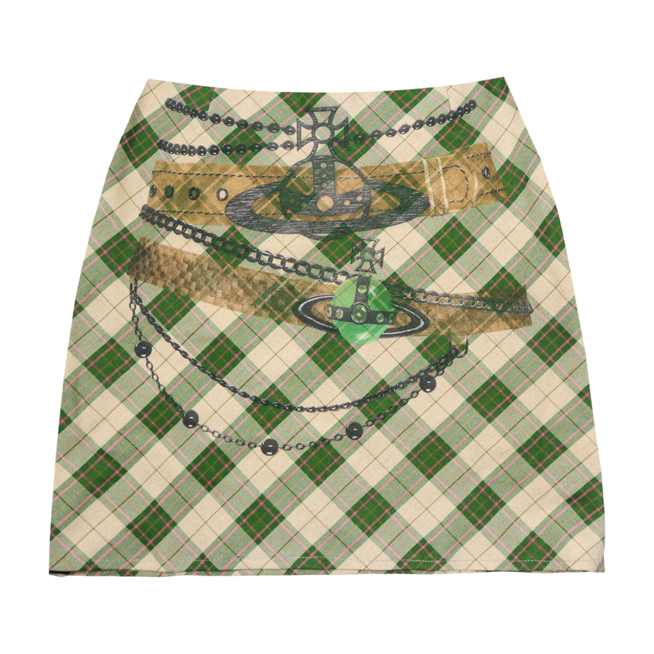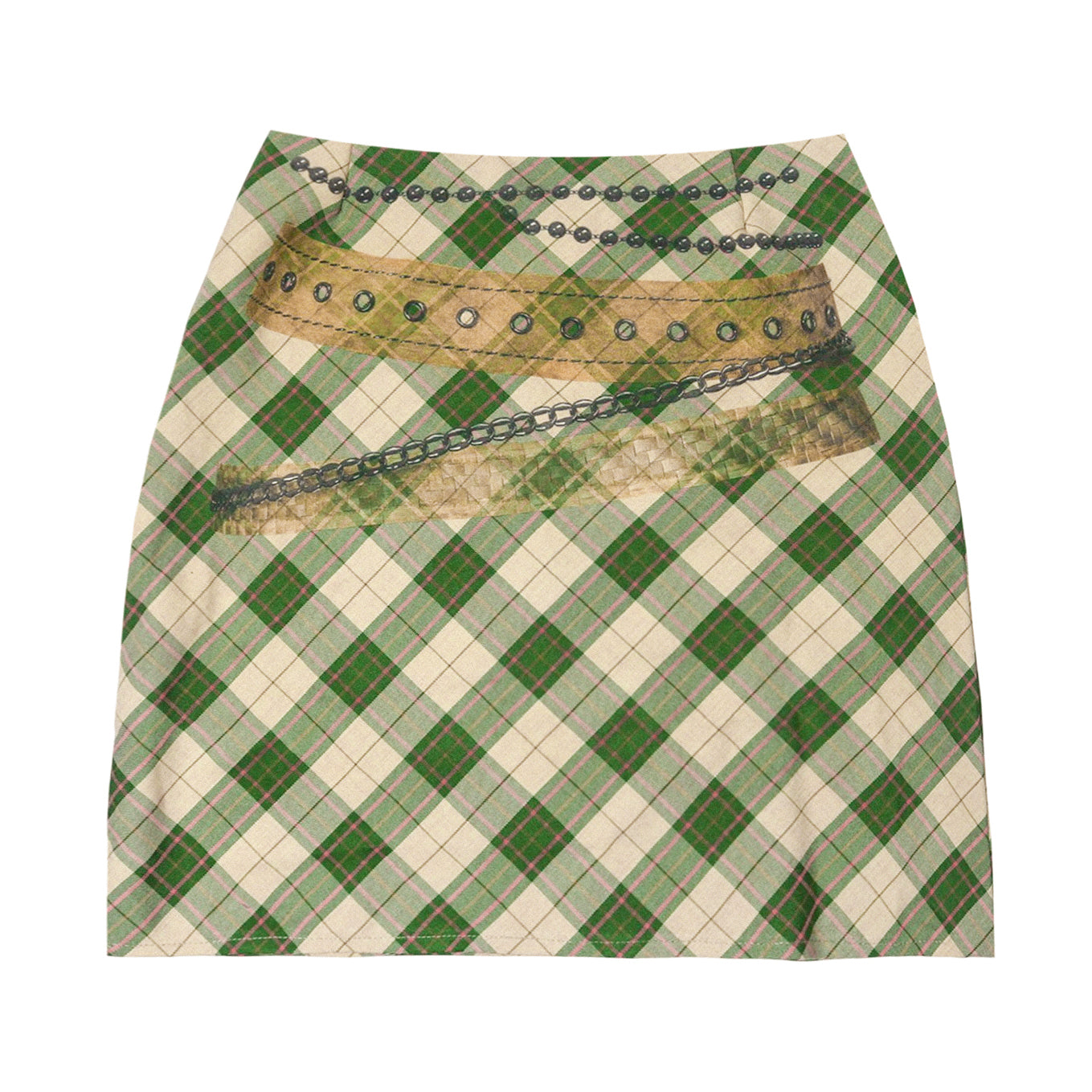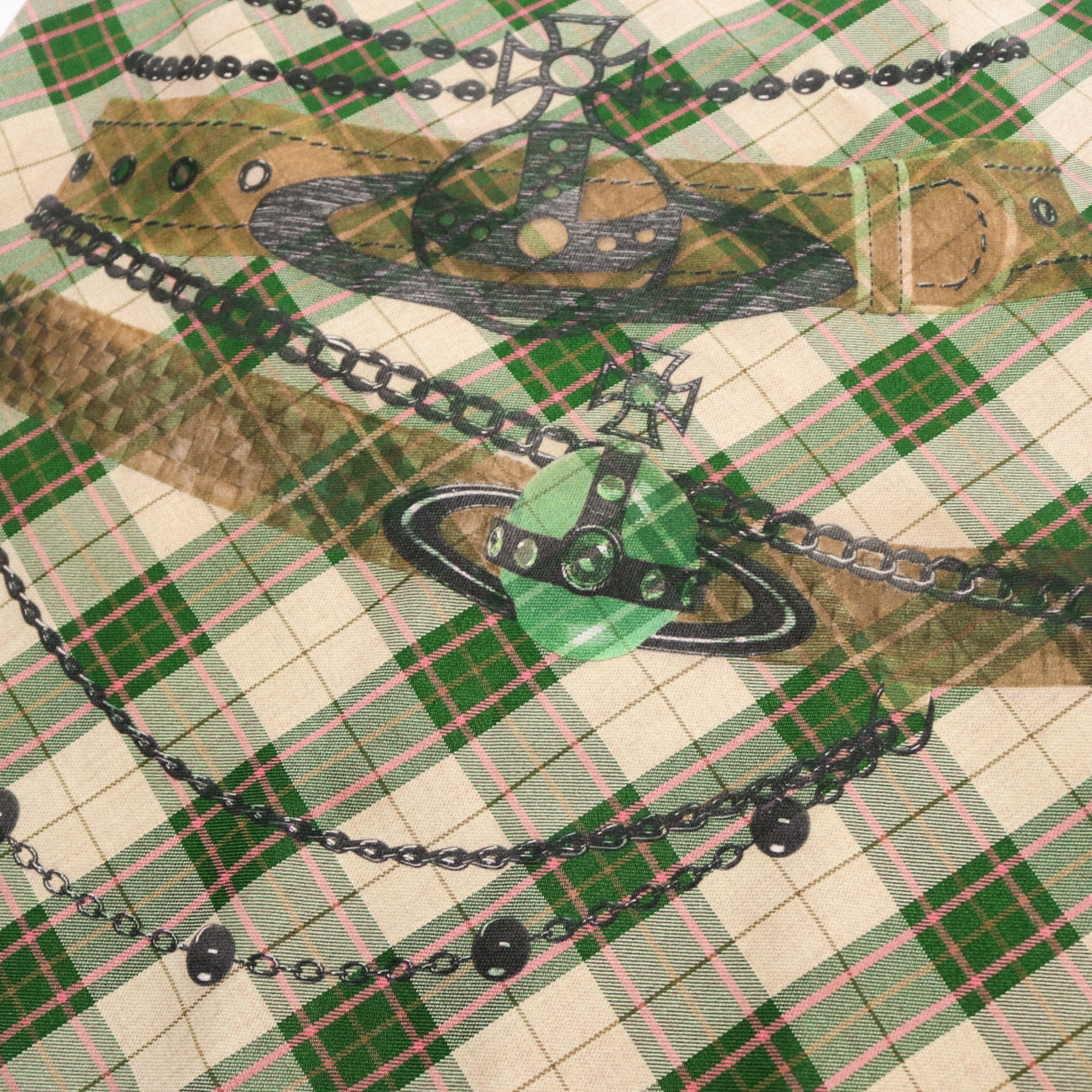 Features: multicolor; checkered print; embroidered orb logo; cropped fit; button closure. Made in Japan.