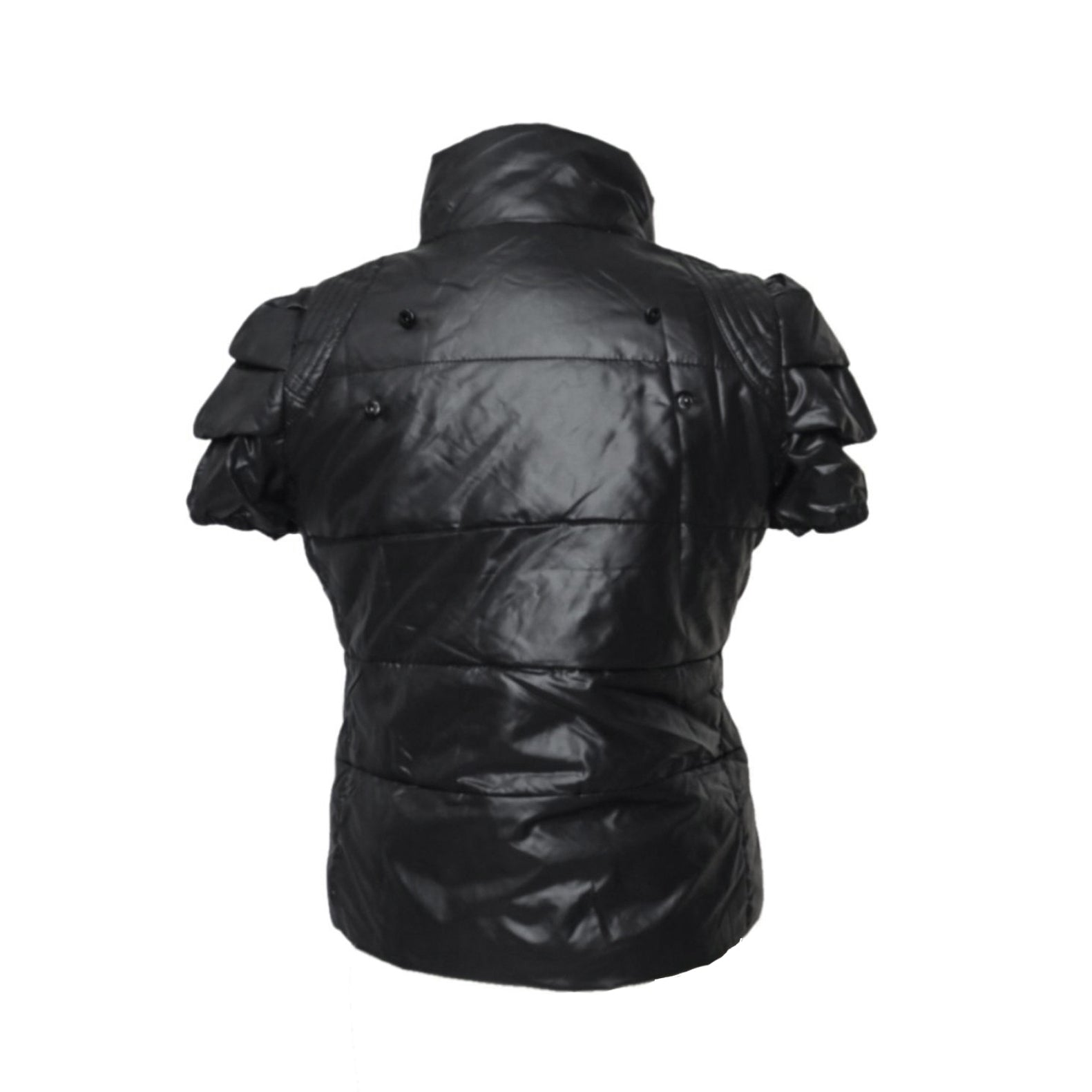 Features: black; bronze-tone Saturn orb rivet embellishments; detachable wing patches at back; sculptural layered cap sleeve; quilted design; high neck; snap button & zipper closures; front pockets.