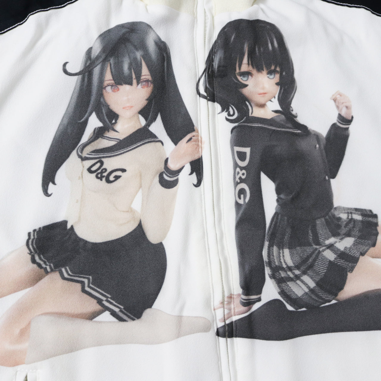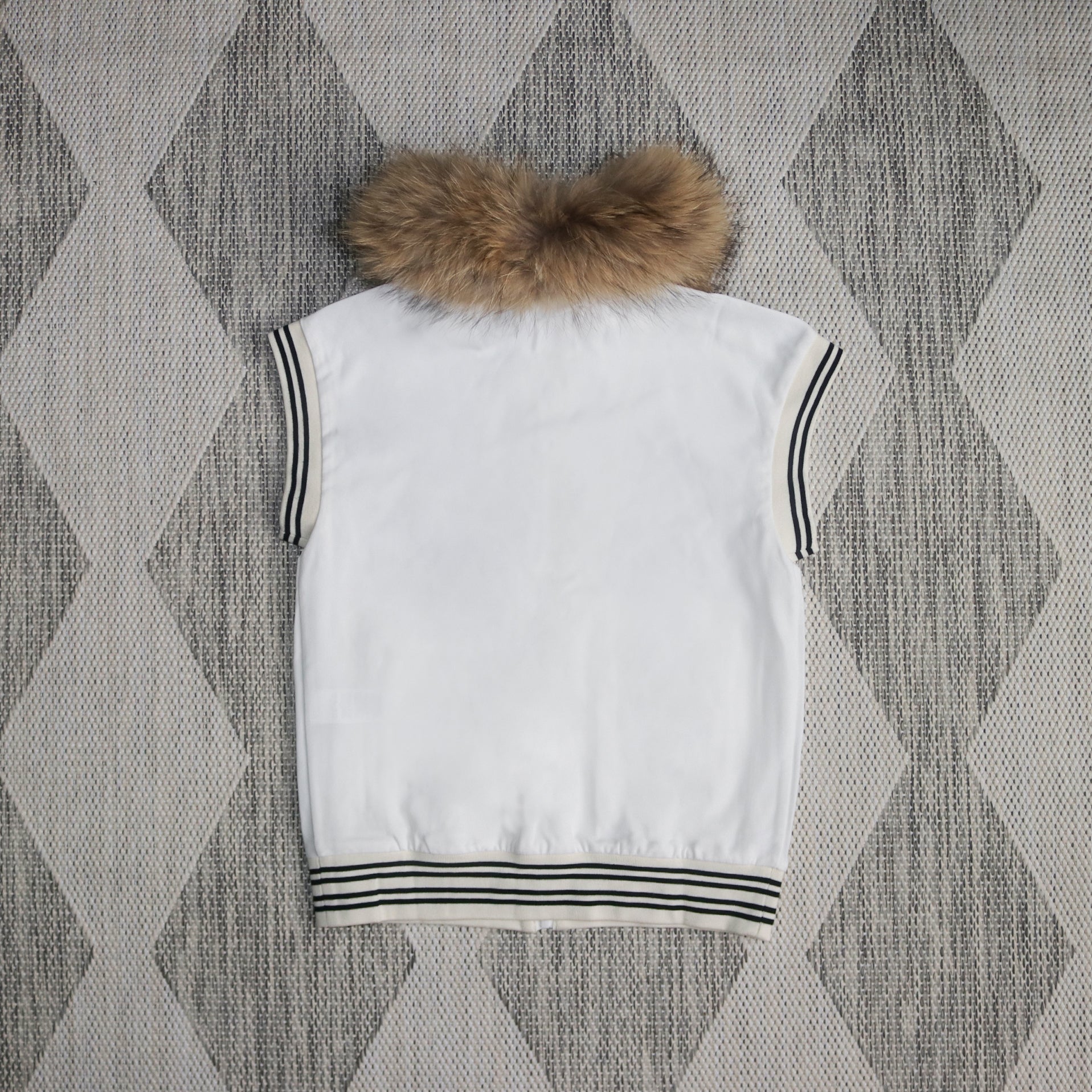 Features: white/black; graphic print to the front; removable fur collar; ribbed cuffs, collar and hem; zip-up stand collar; zippered pockets; oversized fit; appliquéd logo. Made in Italy.