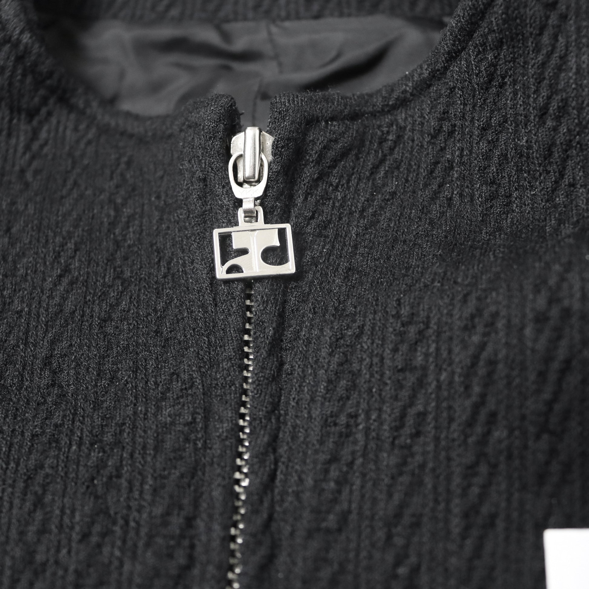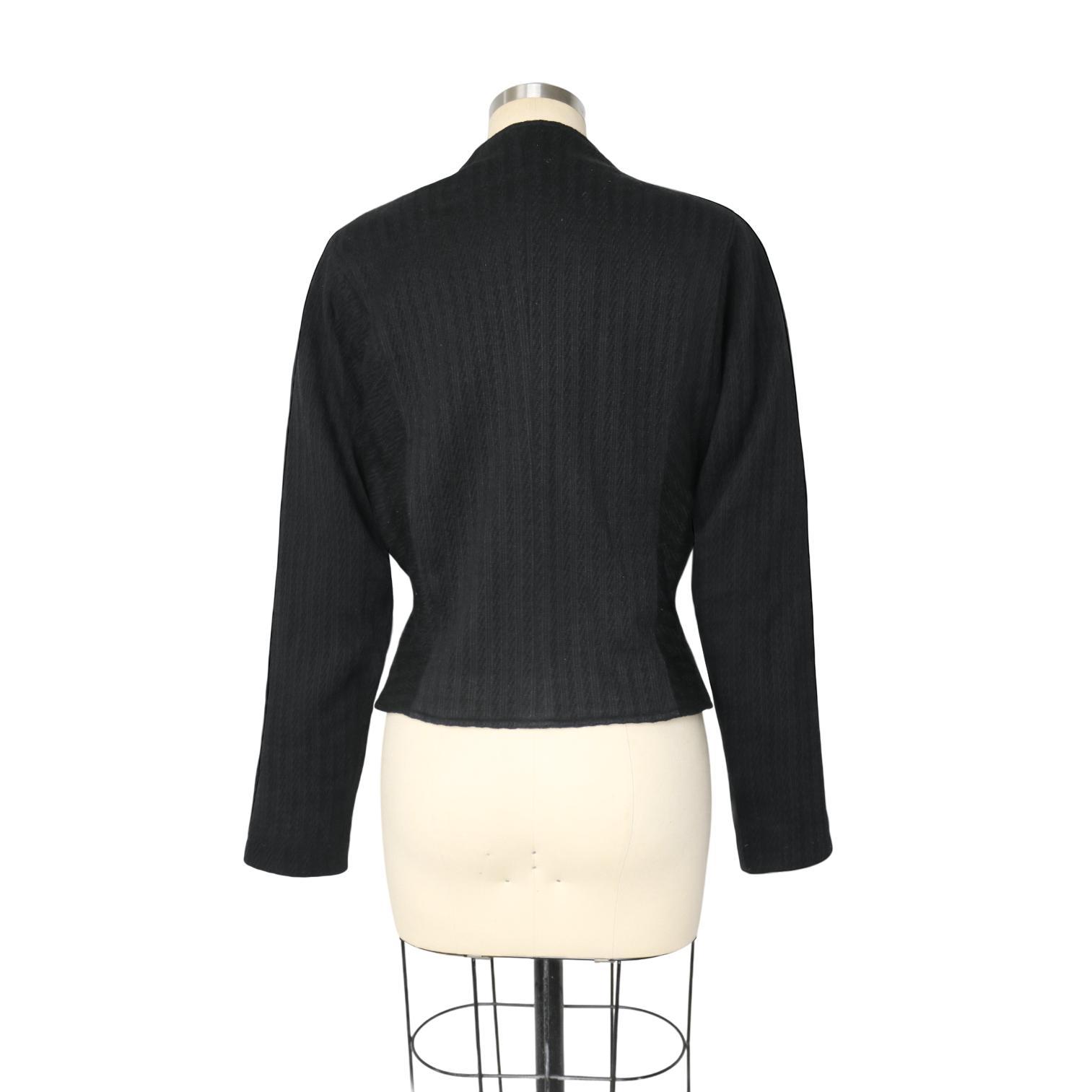 Features: black, textured wool blend material, mock neck, padded shoulder, cropped fit, zippered cuffs, cropped fit.