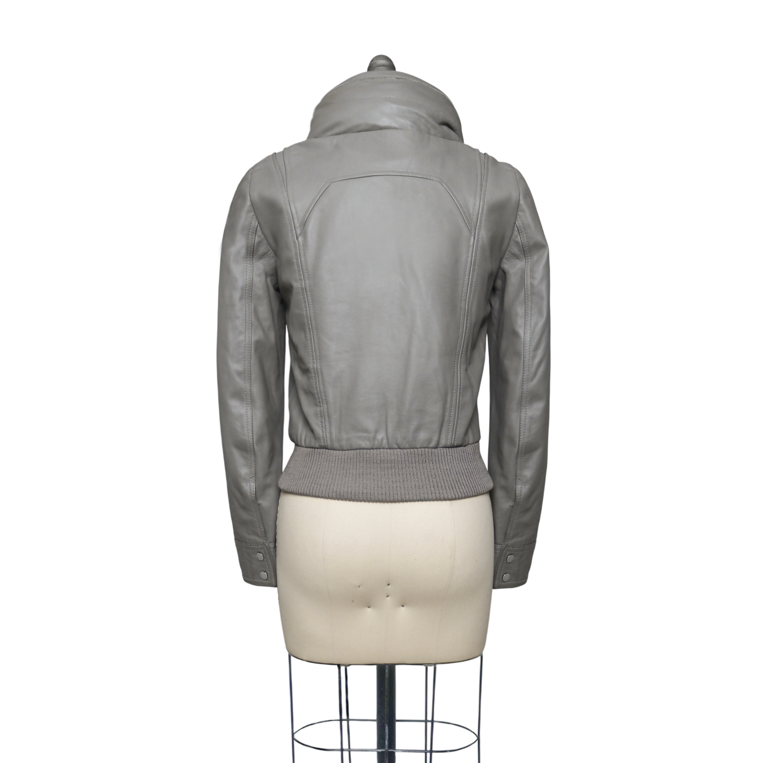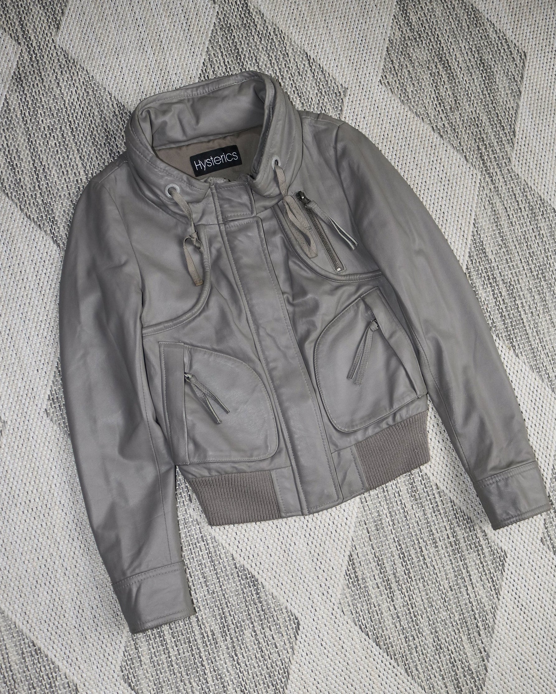 Features: gray; genuine leather; cropped fit; multiple zip pockets; ribbed knit hem; concealed hood; stand collar; made in Japan.