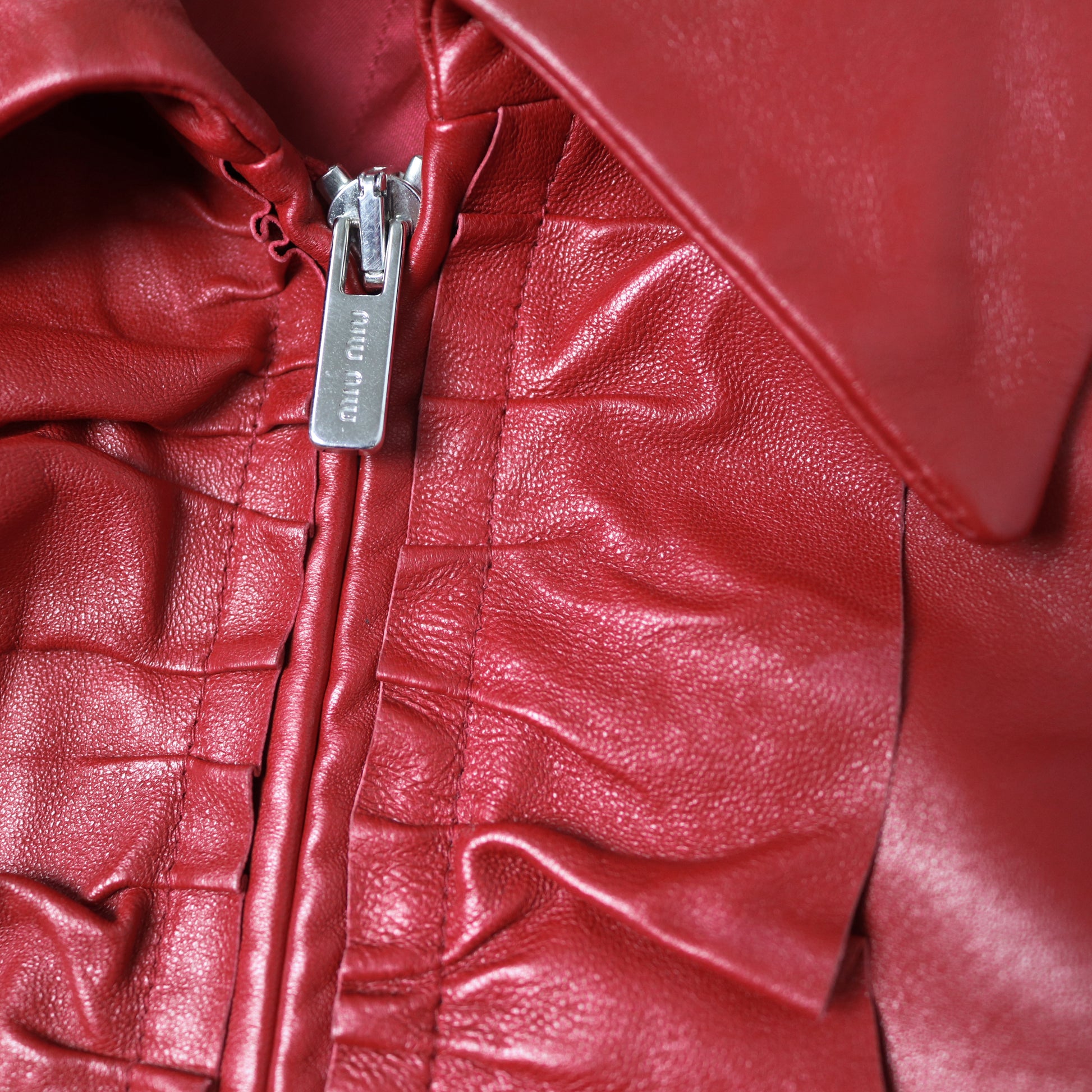 Miu Miu 2014 lambskin jacket, features distinctive ruffle detailing along the zipper, structured pointed collar, and cropped fit adding a subtle sporty edge.