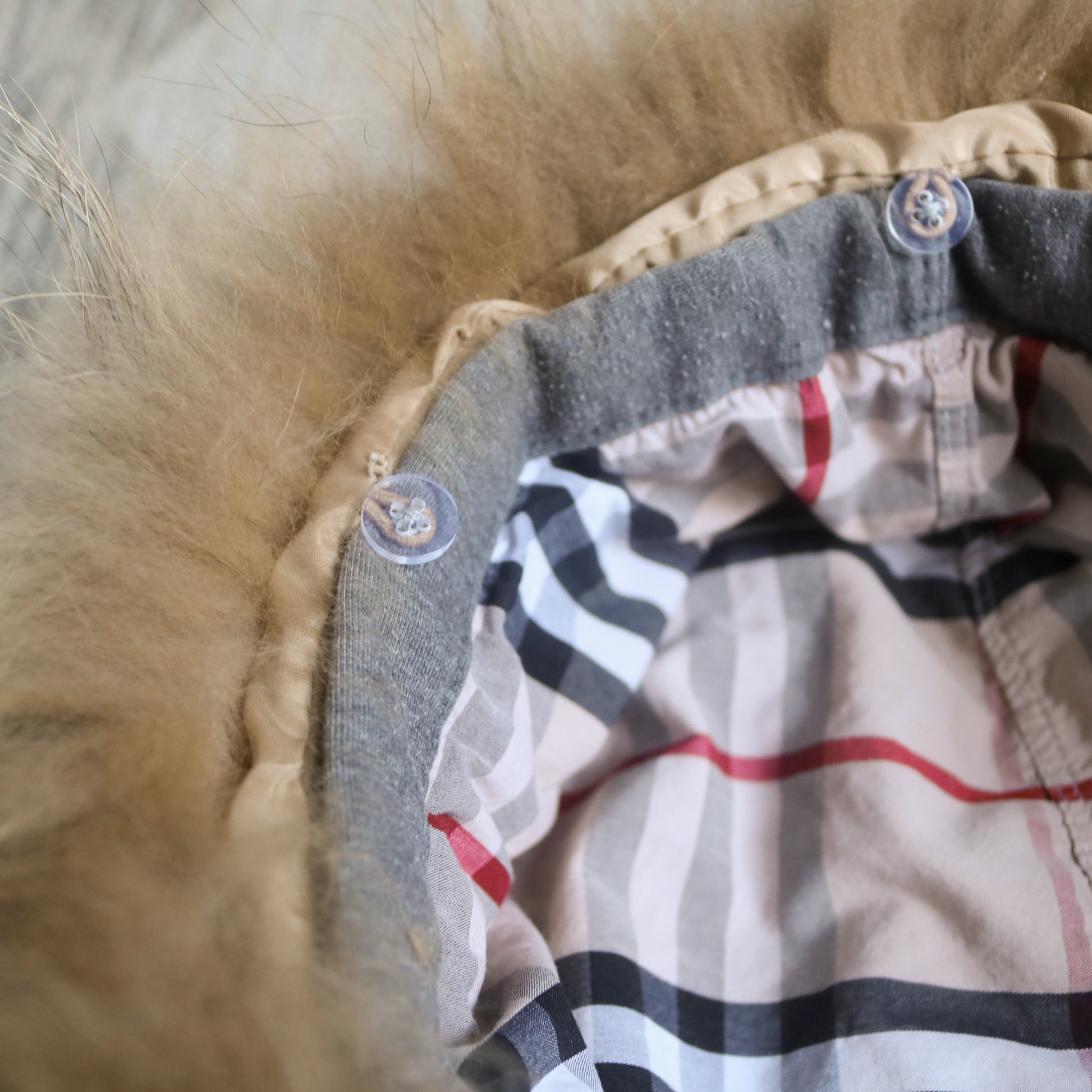 Features: gray; leopard print; studded detail; zip closure; detachable fur trim.